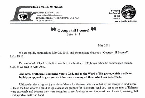 The letter ends with a cryptic plea for his co-workers to “continue to stand with us to proclaim the Gospel through Family Radio.” Now, that leads one to wonder who is going to be left behind out of his group to continue working at the radio station? Wouldn’t they all be going up to Heaven with him? It doesn’t make any sense unless it is his goodbye note for when he commits suicide after his prophecy fails to materialize on May 21. However sad that would be, it would be very much in line for the fate of a modern-day cult leader, which he has clearly become.
